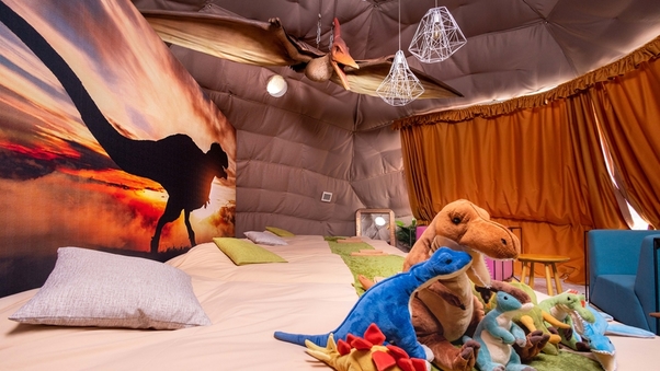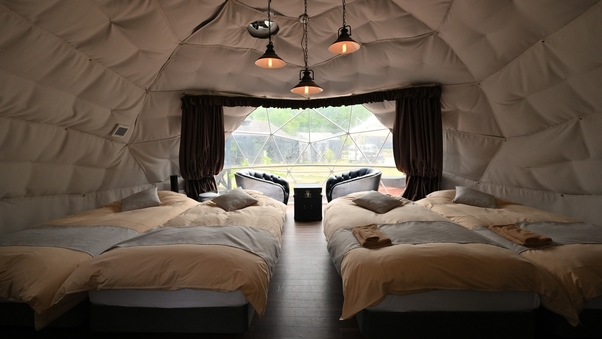 | 恐竜の世界に飛び込んだような、新感覚のグランピング体験♪ BBQで贅沢な食事を楽しみ、ファイヤーピットの炎で心温まる時間を。LEDブランコの幻想的な雰囲気とサウナで、特別なリラックスを体感してください。 |