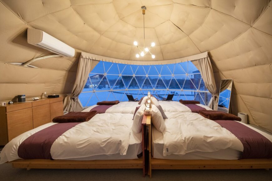| 世代で楽しめる国営備北丘陵公園内にあるグランピング施設。学生から子連れファミリーまで幅広い層に人気があります。水上アクティビティのラフティングや、ピザ窯を使った体験もでき、多彩な楽しみ方が魅力です。 |