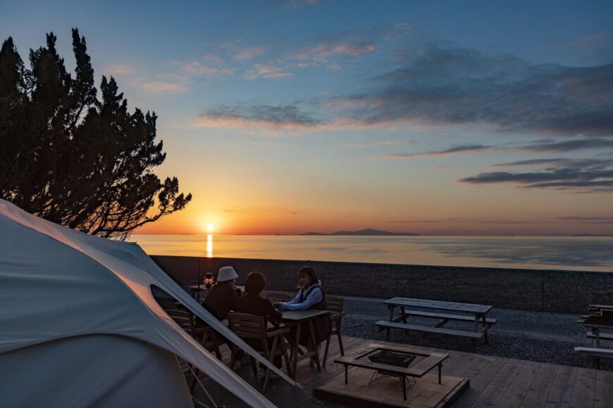 | 目を引く玉ねぎフォルムのテントが特徴的な淡路島のグランピング施設。海を眺めながらサンセットを堪能し、癒しと感動が詰まった滞在を楽しめます。家族や友人と特別な思い出を作りましょう! |
