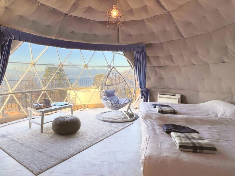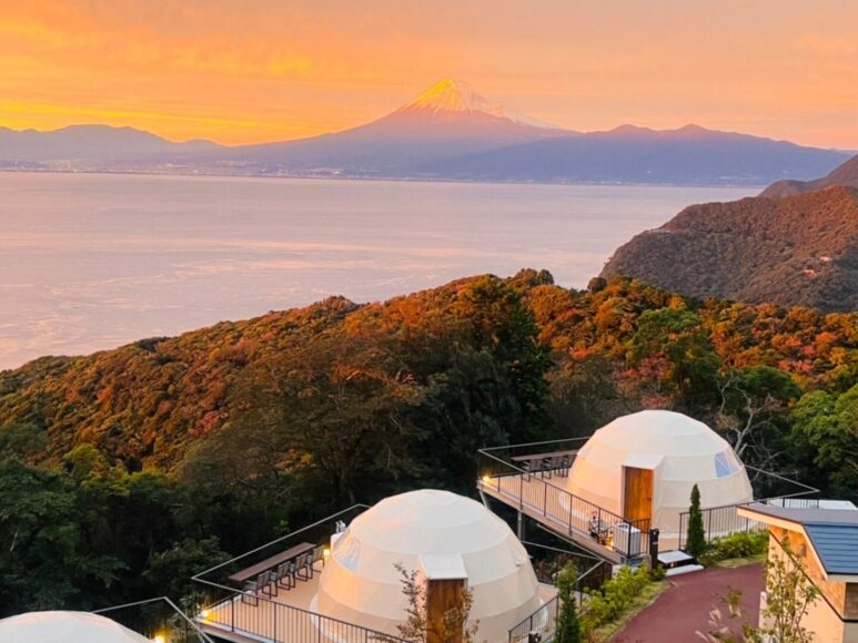 駿河湾を望む富士山の壮大なパノラマが魅力の「天空テラス」。夕陽に染まる空と共に、特別なひとときをお楽しみいただけます。宿泊は快適なドームテントでのグランピングや、半露天風呂付き客室をご用意。選べる鍋料理やBBQを堪能しながら、自然の美しさに包まれたリラックスタイムを満喫してください。飲み放題付きプランで、さらに充実した滞在をお楽しみいただけます。