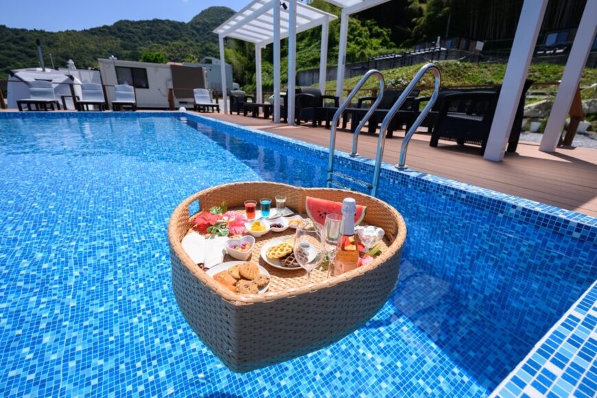 「せとうちアイランドステイズ周防大島」は、瀬戸内海の絶景を楽しめるオーシャンビュースイートヴィラが自慢のグランピングリゾート。地元の海の幸・山の幸を堪能できるBBQや、カフェ、プール、フォトビーチなど、施設内でも多彩な楽しみ方が広がります。愛犬と泊まれるドッグラン付きヴィラも用意されており、家族や友人との特別なひとときをお楽しみください。