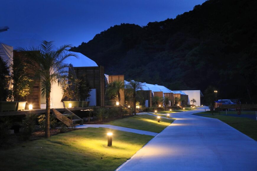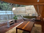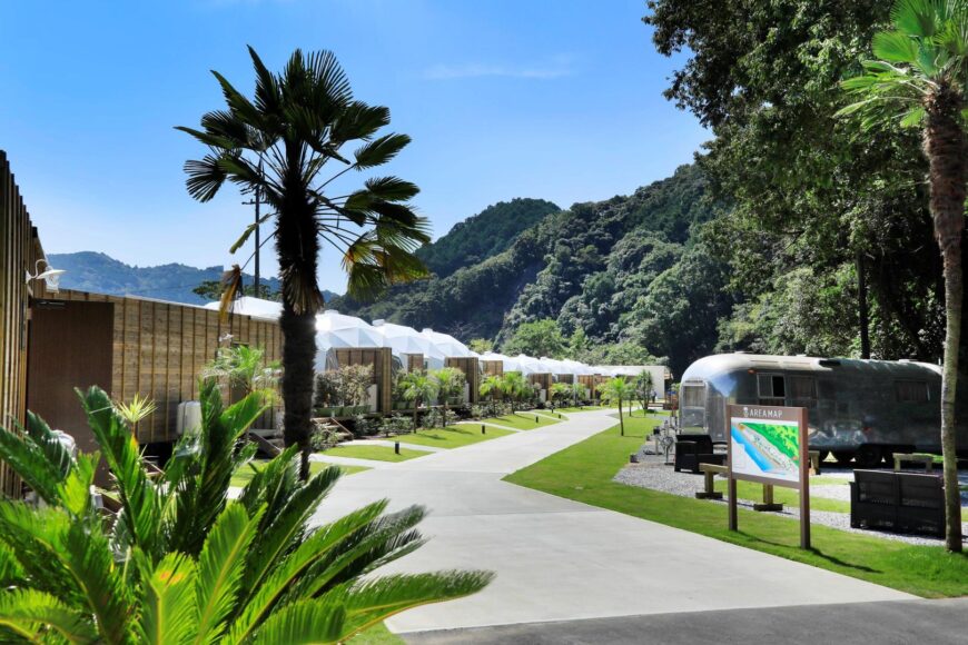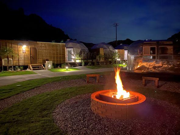 南国リゾートのような癒しの空間を提供するリバ・ウッド・リゾート。全棟に露天風呂付きで、ドームテントやキャンピングトレーラーは広々とした快適な造り。自然に包まれた環境で、国産牛サーロインや地元食材を使用したBBQを堪能できます。ヤシの木が揺れる穏やかな空気の中で、家族や友人とプライベートな時間を楽しめる贅沢な施設です。