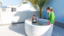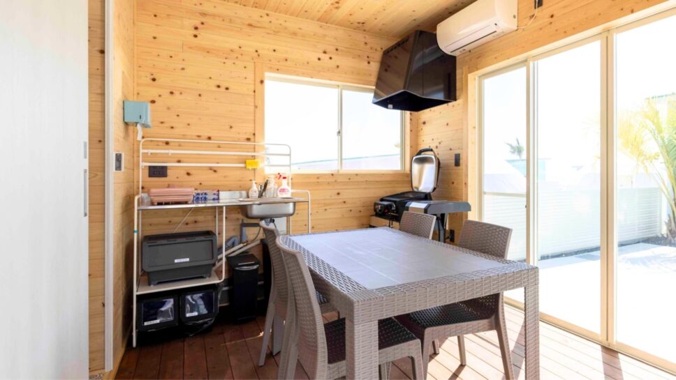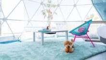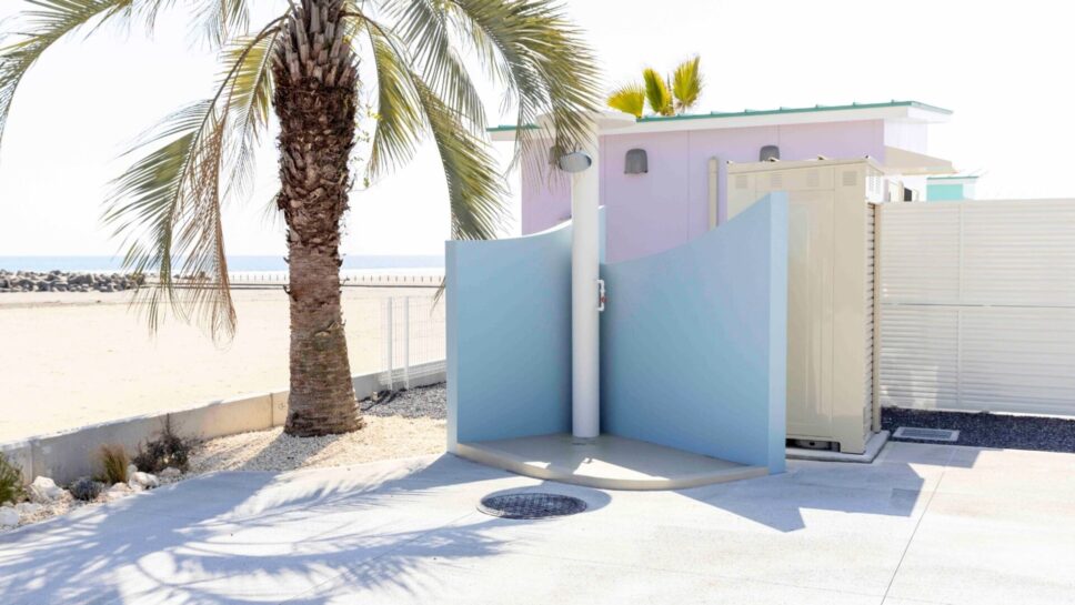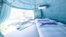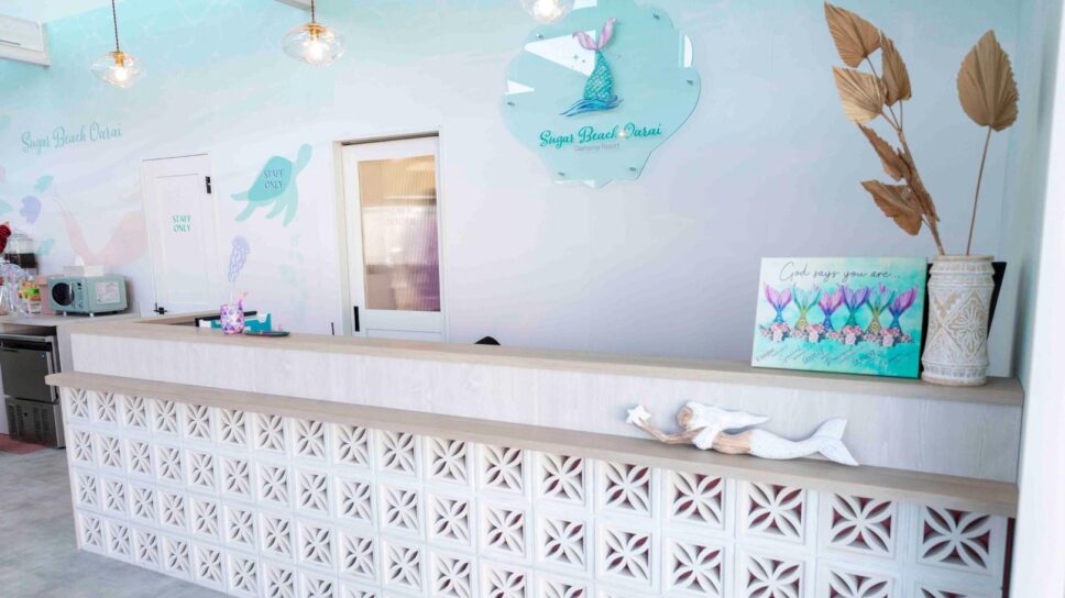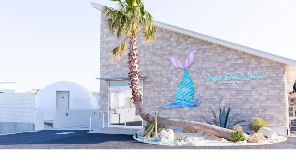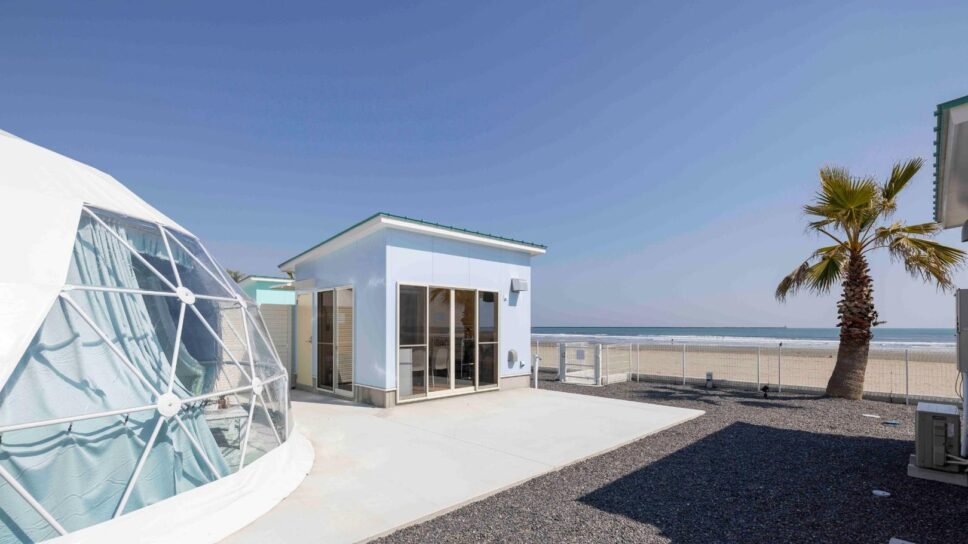 | 気分は陸のマーメイド♪海まで0秒の贅沢なビーチグランピングをご体験ください。管理棟には人魚のヒレをモチーフにしたデザインが施され、白とパステルカラーを基調としたドームテントが魅力的です。 |