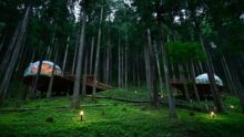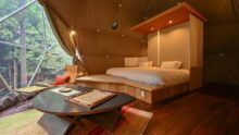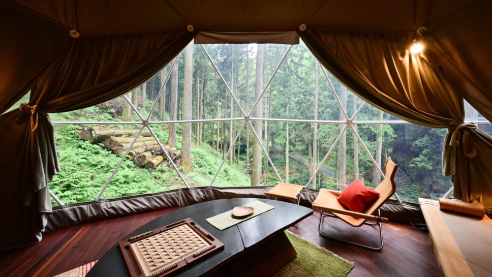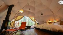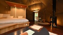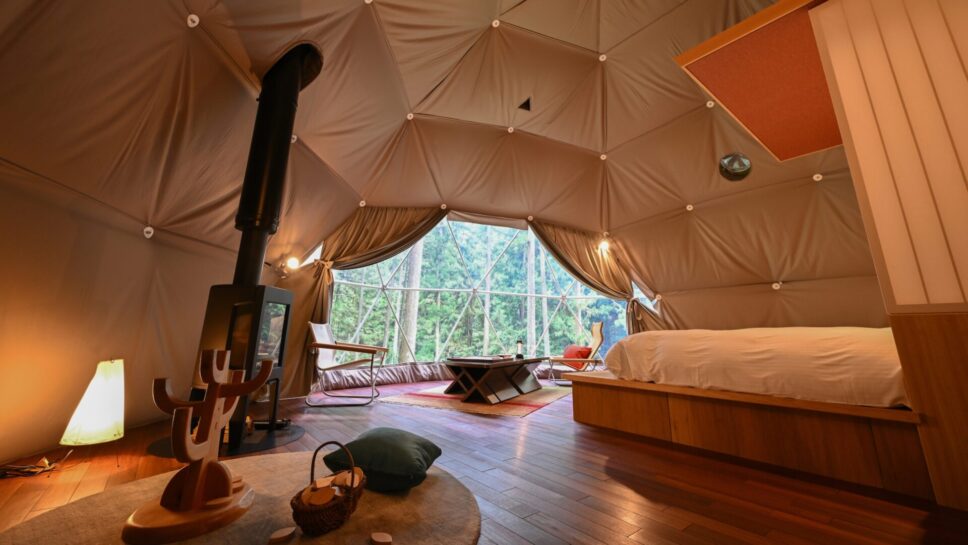 | 一棟貸切のドームテントは広々としており、薪ストーブやバルミューダ製の家電が揃うお洒落空間。夕食は旅館での豪華な会席料理、温泉も楽しめて、朝食は専用バスケットで届けられるサンドイッチ。グランピングと旅館ステイのいいとこどりな施設です! |