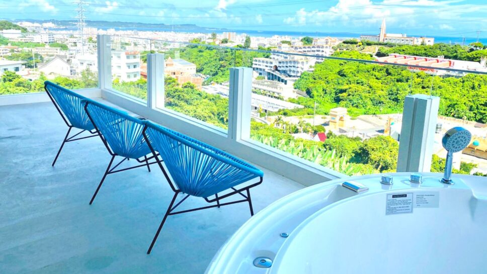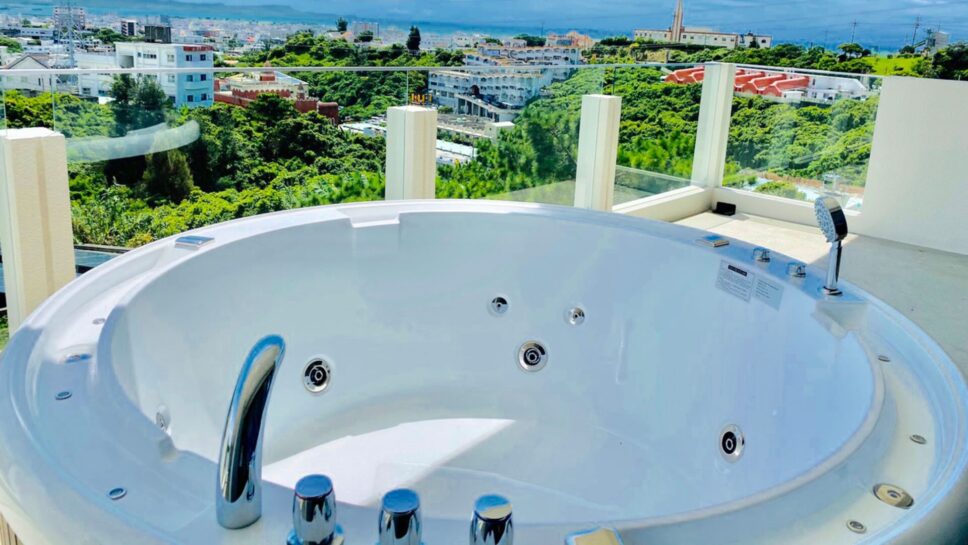 | 全室スイート仕様のプライベート空間で、露天ジャグジーを堪能!青い海と空、赤瓦屋根とガジュマルの緑が織りなす美しい景色を眺めながら、非日常的な贅沢な時間を過ごせます。 |
