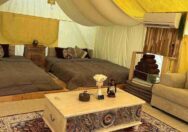 慶佐次CAMP SITEのグランピングはアウトドアとホテルステイの良いとこ取り!テラス部分では焚き火やBBQをお楽しみ頂いただけ、テント内に入ると広々とした開放感のある空間をご用意。空調も完備しています。ベッドフレームにはヒノキを使用しているので、心地よい香りに包まれながらお休みいただけます。