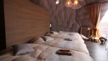 「ホテル丹後王国」では、愛犬と一緒に宿泊できるグランピングプランを提供しています。1日1組限定で、自然に囲まれたプライベート空間で特別なひとときをお過ごしいただけます。施設内にはテントサウナやジャグジープールがあり、園内の「小さな動物園」や「芝すべり」などのアクティビティも楽しめます。夕食には、地元の新鮮な食材を使用したBBQを堪能でき、朝食はホテルレストランにてビュッフェ形式で提供されます。愛犬用のアメニティも充実しており、安心してご利用いただけます。