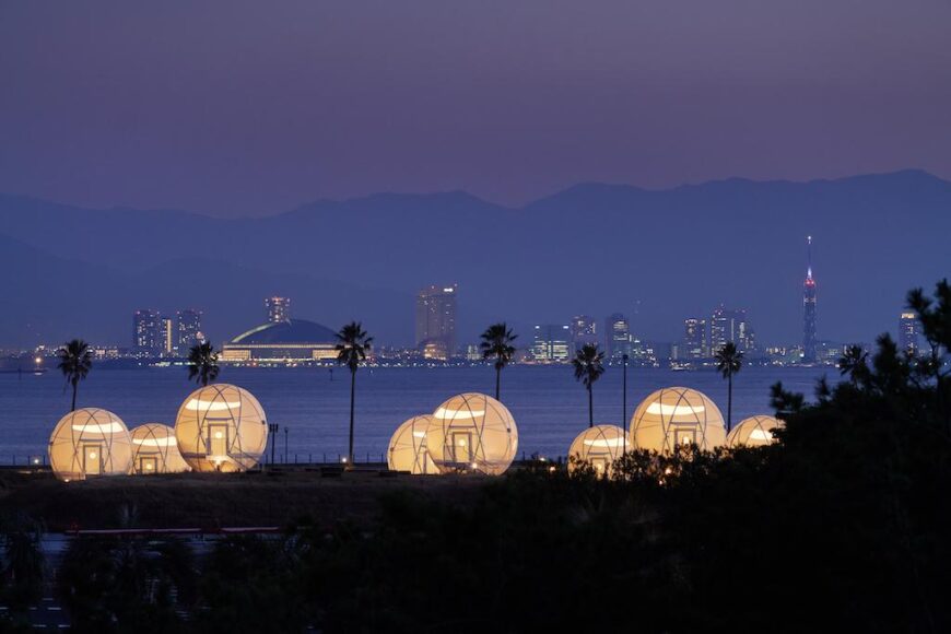 | 博多湾の夜景と自然が楽しめるユニークな宿泊施設!球体テントやアスレチックなど家族やカップルでの特別な滞在にぴったり。 |