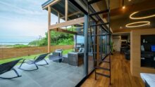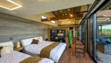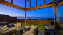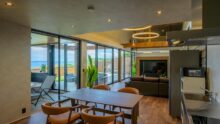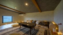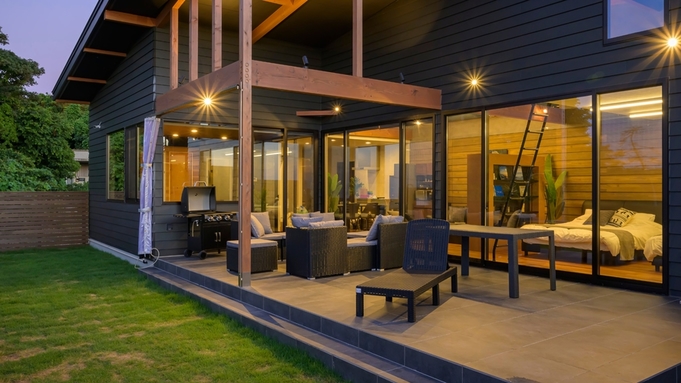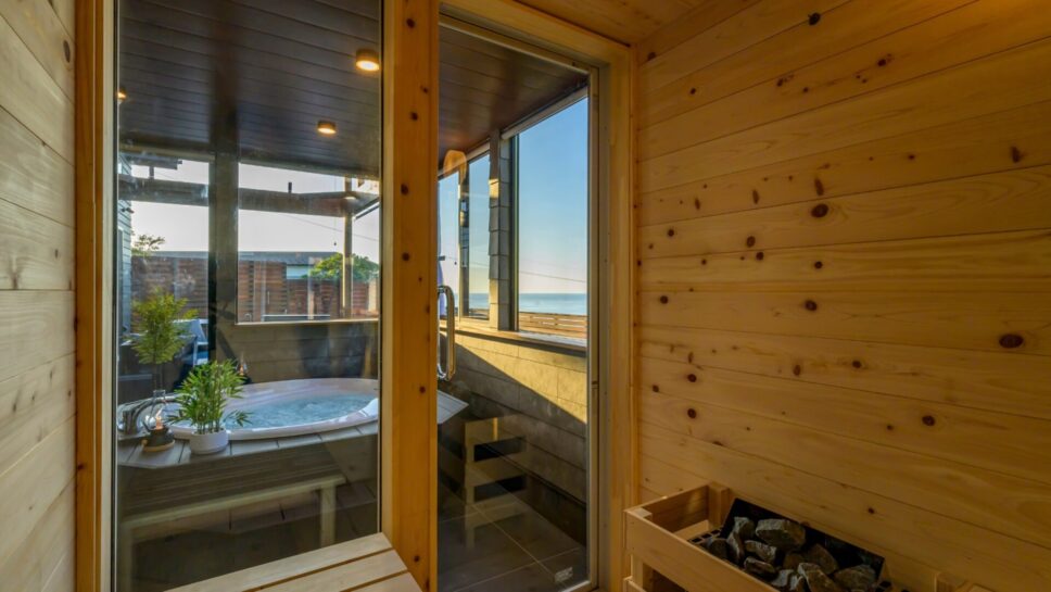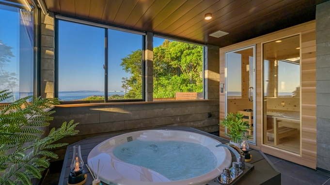 鷹巣荘に隣接するVILLA TAKASU。日本海を見下ろす小高い丘に佇む2棟のラグジュアリーコテージ。 全面窓から日本海を見晴らす贅沢な空間にはプライベートサウナやジャグジーを備える、まさに「大人の隠れ家」。 ミニキッチン、リビングスペース、寝室はシモンズのクイーンベッドで目の前が海と空の絶景!テラスでは海を眺めてのんびり過ごしたり、季節限定でオープンエアBBQを楽しめます。各種調理器具等も完備。